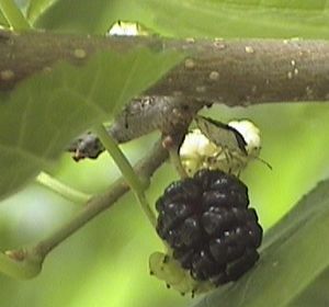 وثمرة التوت عبارة عن ثمرة مركبة أي عدة ثمار متجمعة مع بعضها بعضا ، وكل منها تكونت زهرة مستقلة. وعندما تنضج الثمرة ، تصبح عصارية شهية الطعم ، ويمكن تناول الثمار طازجة أو محفوظة أو تصنع منها المربى.