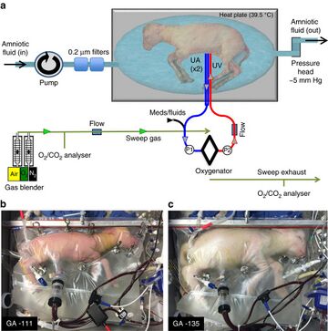 - ^ أ ب Partridge, Emily A.; Davey, Marcus G.; Hornick, Matthew A.; McGovern, Patrick E.; Mejaddam, Ali Y.; Vrecenak, Jesse D.; Mesas-Burgos, Carmen; Olive, Aliza; Caskey, Robert C.; Weiland, Theodore R.; Han, Jiancheng; Schupper, Alexander J.; Connelly, James T.; Dysart, Kevin C.; Rychik, Jack; Hedrick, Holly L.; Peranteau, William H.; Flake, Alan W. (25 April 2017). "An extra-uterine system to physiologically support the extreme premature lamb". Nature Communications. 8: 15112. Bibcode:2017NatCo...815112P. doi:10.1038/ncomms15112. PMC 5414058. PMID 28440792.