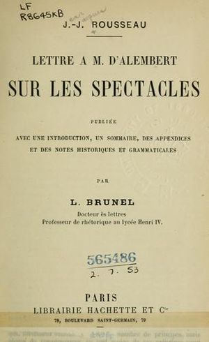رسالة إلى م. دالمبير حول فنون الاستعراض فرنسية: Lettre a M. d’Alembert sur les Spectacles كتبها جان-جاك روسو في 1758.