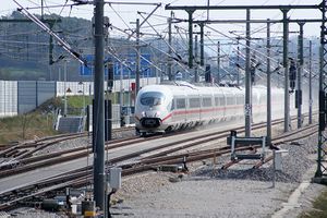 At 300 km/h, an ICE 3 (DB class 403) releases sand from several bogies to the rails.