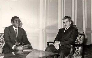 موگابى في اجتماع مع الزعيم الشيوعي الروماني نيقولاي تشاوشسكو عام 1979.