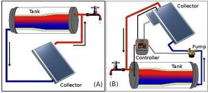 (نظام فعال) يستخدم مضخة كهربائية لتوزيع الحرارة المنقولة للسائل.اما(النظام السلبي) لا يحتوي على مضخة. كمية المياه الساخنة من الطاقة الشمسية في سخان المياه تنتج بالاعتماد على نوع وحجم النظام، وكمية الشمس المتاحة في الموقع، والتركيب الصحيح، وزاوية الميل واتجاه الجامع.