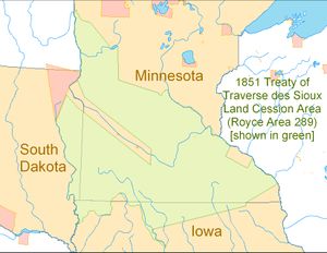Map showing the boundaries of the 1851 Treaty of Traverse des Sioux land cession area (Royce Area 289)