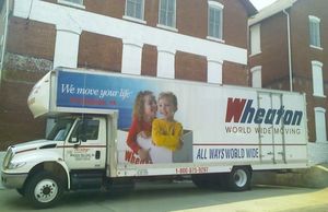 A "straight-job" International moving truck.