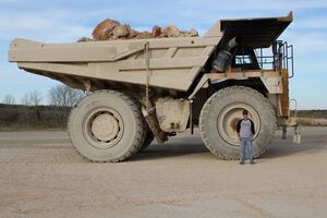 The term "dump" truck is not generally used by the mining industry, or by the manufacturers that build these machines. The more appropriate U.S. term for this strictly off-road vehicle is "haul truck" and the equivalent European term is "dumper".