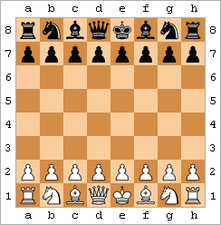 لعبة الشطرنج تتم على رقعة مربعة بها ثمانية خطوط و ثمانية أعمدة (64 مربع) متناوبة الألوان بيضاء و سوداء تكون متجهة بحيث يكون المربع في الركن السفلي على اليمين أمام كل لاعب لونه فاتح و كل ملكة على مربع من نفس لونها.