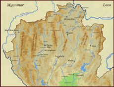 Parallel mountain ranges extend from the Daen Lao Range (ทิวเขาแดนลาว), in the southern region of the Shan Hills, in a north–south direction, the Dawna Range (ทิวเขาดอยมอนกุจู) forming the western border of Thailand between Mae Hong Son and the Salween River.[7] To the east the Thanon Thong Chai Range (เทือกเขาถนนธงชัย), the Khun Tan Range (ทิวเขาขุนตาน), the Phi Pan Nam Range (ทิวเขาผีปันน้ำ), as well as the western part of the Luang Prabang Range (ทิวเขาหลวงพระบาง), form the natural region of the Thai highlands together with the former.[8]