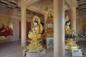In March 1941, under the government's religious policy, Shingon schools were forcibly merged to form the 'Dai-Shingon' sect. During the second world war, prayers for the surrender of enemy nations were frequently held at various temples. After the war, both Ko-Gyō and Shin-Gyō schools continued to separate, and some established their own unique doctrines and traditions. There are now around eighteen major Shingon schools with their own headquarter temples (honzan) in Japan. Yamasaki estimated the number of Shingon followers at ten million and the number of priests at sixteen thousand in around eleven thousand temples (in his 1988 book).[46] In Japan, there are also several new Shingon influenced groups classified as 'New Religions'. Some of these new movements include Shinnyo-en, Agon-shu and Gedatsu-kai.[47]