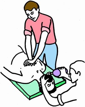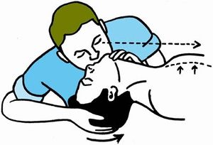 تنفس اصطناعي فماً لفم 3 - 5 مرات متتالية مع ملاحظة حركة جدار الصدر ويجب أخذ الحذر عند الأطفال وتجنب الانثقاب الرئوي أو الريح الصدرية.