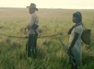 Savanna Pumé couple on a hunting and gathering trip in the llanos of Venezuela. The man carries a bow, three steel-tipped arrows, and a hat that resembles the head of a jabiru stork as camouflage to approach near enough to deer for a shot. The woman carries a steel-tipped digging stick and a carrying basket for collecting wild tubers.
