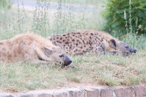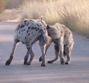 A pair of spotted hyenas at White River, Mpumalanga. Note the great degree of individual variation in fur colour, which was once used as a basis for separating the species into various subspecies