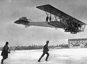 During 1913, Igor Sikorsky developed the first large multi-engine airplane, the Russky Vityaz.[4][5] This aircraft was subsequently refined into the more practical Ilya Muromets, being furnished with dual controls for a pilot and copilot and a comfortable cabin with a lavatory, cabin heating and lighting.[6] This large four-engine biplane was further adapted into an early bomber aircraft, preceding subsequent transport and bomber aircraft.[6] It first flew on 10 December 1913 and took off for its first demonstration flight with 16 passengers aboard on 25 February 1914. However, it was never used as a commercial airliner due to the onset of the First World War which led to military applications being prioritised.[7][8]