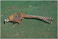 - التَّدْرُج المطوق الرقبة، الذي وجد أصلاً في آسيا الوسطى. وقد نقله الرومان إلى أجزاء كثيرة في أوروبا منذ حوالى 2,000 عام. وقد أُخذَت الطيور المطوقة الرقبة إلى أُستراليا، وشمالي أمريكا خلال القرن التاسع عشر. ويبلغ طول الذكور من 75 إلى 90سم، بما فيه الذيل، ويُغطي رؤوسها ورقابها ريش أزرق ـ مخضر زاه، وجسمها بني أسود، وأبيض. وكثير من الديوك ـ لها أطواق بيضاء حول رقابها، ويحيط جلد أحمر بعيونها في شكل دائرة، والدجاجات مرقشة بالبني، من غير أطواق في الرقبة. وتنمو إلى طول يتراوح بين 50 و 65سم.