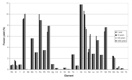 | 6.2956% | Zirconium | 93Zr | 1.53 My | Long-lived fission product also produced by neutron activation in zircalloy cladding. |