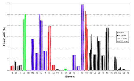 | 0.0003% | Cadmium | 113mCd | 14.1 y | Neutron poison, most will be destroyed while fuel still in use. |