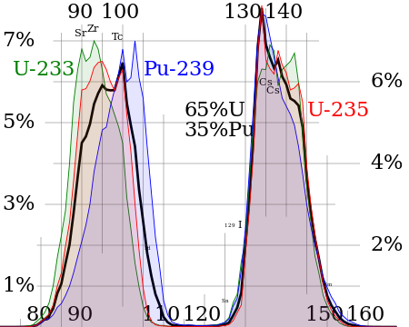 If a graph of the mass or mole yield of fission products against the atomic number of the fragments is drawn then it has two peaks, one in the area zirconium through to palladium and one at xenon through to neodymium. This is because the fission event causes the nucleus to split in an asymmetric manner,[1] as nuclei closer to magic numbers are more stable.[2]