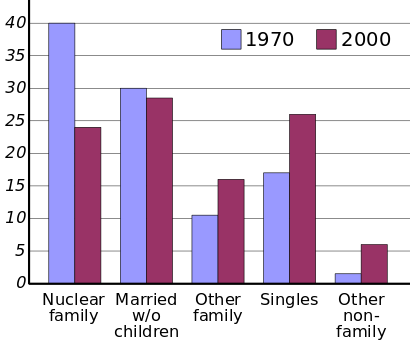The term blended family or stepfamily describes families with mixed parents: one or both parents remarried, bringing children of the former family into the new family.[44] Also in sociology, particularly in the works of social psychologist Michael Lamb,[45] traditional family refers to "a middle-class family with a bread-winning father and a stay-at-home mother, married to each other and raising their biological children," and nontraditional to exceptions to this rule. Most of the US households are now non-traditional under this definition.[46] Critics of the term "traditional family" point out that in most cultures and at most times, the extended family model has been most common, not the nuclear family,[47] though it has had a longer tradition in England[48] than in other parts of Europe and Asia which contributed large numbers of immigrants to the Americas. The nuclear family became the most common form in the U.S. in the 1960s and 1970s.[49]