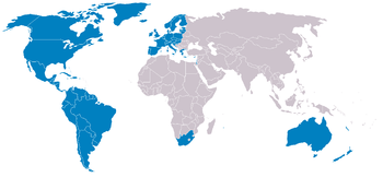 Huntington's map of major civilizations,[1] What constitutes Western civilization in his view is coloured dark blue. Huntington gave the most stringent interpretation of the term; it is based on culture tradition and history.