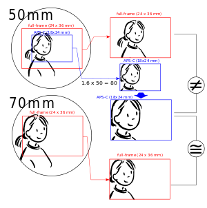 اعتبارا من 2015[تحديث], many interchangeable-lens digital cameras have image sensors that are smaller than the film format of full-frame 35 mm cameras.[ب] For the most part, the dimensions of these image sensors are similar to the APS-C image frame size, i.e., approximately 24 mm x 16 mm. Therefore, the angle of view for any given focal-length lens will be narrower than it would be in a full-frame camera because the smaller sensor "sees" less of the image projected by the lens. The camera manufacturers provide a crop factor (sometimes called a field-of-view factor or a focal-length multiplier) to show how much smaller the sensor is than a full 35 mm film frame. For example, one common factor is 1.5 (Nikon DX format and some others), although many cameras have crop factors of 1.6 (most Canon DSLRs), 1.7 (the early Sigma DSLRs) and 2 (the Four Thirds and Micro Four Thirds cameras). The 1.5 indicates that the angle of view of a lens on the camera is the same as that of a 1.5 times longer focal length on a 35 mm full-frame camera, which explains why the crop factor is also known as a focal-length multiplier. For example, a 28 mm lens on the DSLR (given a crop factor of 1.5) would produce the angle of view of a 42 mm lens on a full-frame camera. So, to determine the focal length of a lens for a digital camera that will give the equivalent angle of view as one on a full-frame camera, the full-frame lens focal length must be divided by the crop factor. For example, to get the equivalent angle of view of a 30 mm lens on a full-frame 35 mm camera, from a digital camera with a 1.5 crop factor, one would use a 20 mm lens.