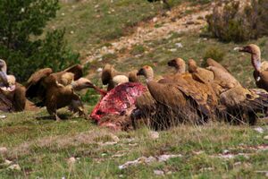 In Spain and France, in 2008, there were 25,000 birds, from a low of a few thousand around 1980. Spain has the biggest colony of Griffon vultures in all Europe. It is located at Hoces del Río Duratón Natural Park (Province of Segovia). In Portugal a few hundred pairs of griffons nest, but their distribution is strongly asymmetric. The main areas of reproduction are located in the northeast (Douro International), which is home to more than half of the Portuguese population. Though permanently resident in the interior of the country, the griffon vulture often ventures west when the breeding season is over and can occasionally reach the Tagus Estuary and Cape St. Vincent.[21] The Pyrenees population has apparently been affected by an EC ruling that due to danger of BSE transmission, no carcasses must be left on the fields for the time being. This has critically lowered food availability, and consequently, carrying capacity. Although the griffon vulture does not normally attack larger living prey, there are reports of Spanish griffon vultures killing weak, young or unhealthy living animals as they do not find enough carrion to eat.[22] In May 2013, a 52-year-old woman who was hiking in the Pyrenees and had fallen off a cliff to her death was eaten by griffon vultures before rescue workers were able to recover her body, leaving only her clothes and a few of her bones. Due to her being the first human to be documented being eaten by griffon vultures, the story brought worldwide attention to the griffon vulture problems in Southern Europe.[23]