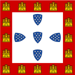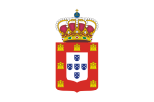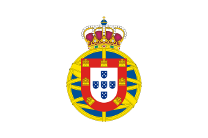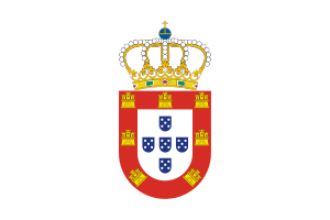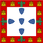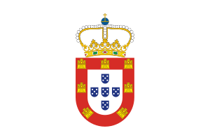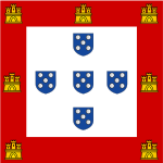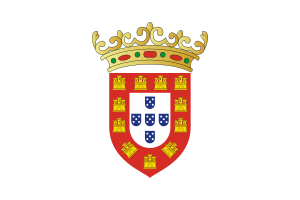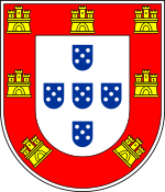 - ^ From the original Portuguese blazon: "De prata, cinco escudetes, de blau, postos em cruz, cada um carregado com cinco besantes, de prata, postos em aspa; bordadura, de gules, carregada com sete castelos, de ouro, dos quais três em chefe".[1]