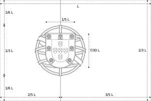 | التصميم | A 2:3 خطان عموديان أفقيان باللون الأخضر والأحمر، ويحتل درع الپرتغال المستطيل الأصغر، الوسط فوق الحد اللوني |