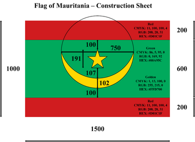 - ^ "Charte graphique de la République islamique de Mauritanie" الهوية البصرية إدارات وهيئات ومصالح [Graphic Guidelines of the Islamic Republic of Mauritania] (PDF). www.kennach.gov.mr (in French and Arabic). Government of Mauritania. May 2020. pp. 7–11. Retrieved 1 September 2025.
