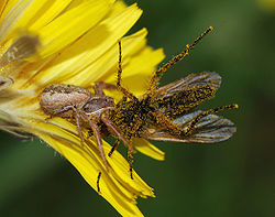 The primitive Liphistiidae, the "trapdoor spiders" (family Ctenizidae) and many tarantulas are ambush predators that lurk in burrows, often closed by trapdoors and often surrounded by networks of silk threads that alert these spiders to the presence of prey.[9] Other ambush predators do without such aids, including many crab spiders,[7] and a few species that prey on bees, which see ultraviolet, can adjust their ultraviolet reflectance to match the flowers in which they are lurking.[25] Wolf spiders, jumping spiders, fishing spiders and some crab spiders capture prey by chasing it, and rely mainly on vision to locate prey.[7]