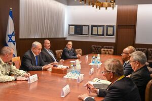رئيس الوزراء الإسرائيلي بنيامين نتنياهو يلتقي رئيس شركة بوينگ للدفاع والفضاء ورئيس بوينگ إسرائيل الجنرال عيدو نحوشطن، لمناقشة التعاون والصفقات الدفاعية المستقبلية مع دولة إسرائيل. هنالك الكثير على مائدة المفاوضات. ولكن اللقاء تركز حول: الطائرات المقاتلة. 19 فبراير 2023. Photo: Kobi Gideon / L.A.M
