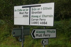 Bilingual road signs, street names, business and advertisement signage (in both Gaelic and English) are gradually being introduced throughout Gaelic-speaking regions in the Highlands and Islands, including Argyll. In many cases, this has simply meant re-adopting the traditional spelling of a name (such as Ràtagan or Loch Ailleart rather than the anglicised forms Ratagan or Lochailort respectively).[73]