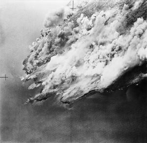 Aerial view of Pantelleria wreathed in smoke from bursting bombs during the Allied bombardment