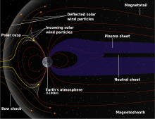 رسم يُوضح بُنية الغلاف المغناطيسي. حيث تأتي الرياح الشمسية من اليسار، فيَحرف الغلاف المغناطيسي مسار بعضها مُبعداً إياها عن الأرض، ويُخلف وراءه ذيلاً مغناطيسياً نتيجة لتفاعله مع جُسيمات الرياح الشمسية المشحونة. أما بقية البلازما فتتجه القطبين حيث تشكل ظاهرة الشفق القطبي.