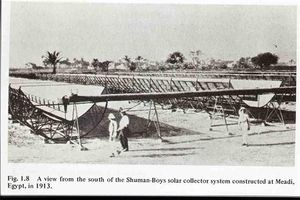 - بنى شومان، مابين عامي 1912 و1913، أول محطة للطاقة الحرارية الشمسية في العالم في ضواحي المعادى في مصر[5]. استخدم شومان في محطته أحواض من قطع مكافئ لتشغيل محرك بقوة 60-70 حصانا لضخ 6000 غالون من الماء في الدقيقة من نهر النيل إلى حقول القطن المجاورة. وحقق نظامه العديد من التحسينات التكنولوجية منها لوحات امتصاص مزدوجة مفصولة بمسافة بوصة واحد. الا أن اندلاع الحرب العالمية الأولى واكتشاف النفط الرخيص في الثلاثينات خفف من اهمية اكتشافته أخرت نهوض استخدامات الطاقة الشمسية مما دفع اكتشافات شومان للاهمال. واعيد احياء أفكاره وتصاميمه الأساسية ورؤيته في السبعينات خلال فترة موجة الاهتمام بالطاقة الشمسية الحرارية. وذكر شومان لصحيفة نيو يوك تايمس عن الحدث[6]:
