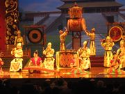 Bronze artifacts also have significant meaning and roles in the Han dynasty as well. People used them for funerary purposes which reflect the aesthetic and artistic qualities of the Han dynasty.[5] Many bronze vessels excavated from tombs in Jiangsu Province, China, have various shapes like Ding, Hu, and Xun which represent traditional Chinese aesthete.[5] These vessels are classical representations of Chinese celestial art forms which play a great role in ancient Chinese's communication with spirits of their ancestors.[5] Other than the vessels, bronze weapons, daily items, and musical instruments are also found in royal Han families' tomb in Jiangsu. Being able to put a full set of Bianzhong in ones tomb signifies his or her status and class in the Han dynasty since this particular type of instrument is only acquired and owned by royal and wealth families.[5] Apparently, Bianzhong and music are also used as a path for the Han rulers to communication with their Gods.[5] The excavation of Bianzhong, a typical and royal instrument found in ancient China, emphasizes the development of complex music systems in the Han dynasty.[5] The set of Bianzhong can vary in many cases; for example, a specific excavation of Bianzhong from Jiangsu Province include different sets of bells, like Niuzhong and Yongzhong bells, and many of them appear in animal forms like the dragon, a traditional Chinese spiritual animal.[5]
