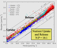 علاقة الفوسفات بالمتناوَل من النترات، وهما المطلوبتان للتمثيل الضوئي، في مختلف مناطق المحيطات. لاحظ أن النترات كثيراً ما تكون هي المقيـِّدة أكثر من الفوسفات. انظر نسبة ردفيلد.