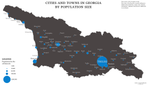 This is a list of the cities and towns (Georgian: ქალაქი, k'alak'i) in Georgia, according to the 2014 census data of the Department of Statistics of Georgia.[1] The list does not include the smaller urban-type settlements categorized in Georgia as daba (დაბა). The list also does not include cities and towns in the disputed territories of Abkhazia and South Ossetia.