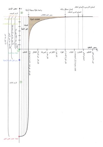 (الشكل 3)وهنا تم تحديد لحظة ولادة الحياة الأولى على الأرض وبداية أولى أشكال الكائنات هي اللحظة 0، لتكون بداية مقياس الزمن وكلّ ما هو بعدها موجب زمنياً وكلّ ما هو قبلها سالب زمنيّاً، كما تم اعتبار انعدام التعقيد نهائياً (وهي حالة الإلكترون الشارد) هو حالة 0 التعقيد، وكلّ ما هو معقّد بعدها يكون موجباً حتماً لأنّه أكثر تعقيداً من حالة انعدام التعقيد في الإلكترون الشارد.