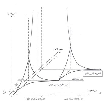 ويمكن الملاحظة أنّ هذا المنحني يمثّل الدورة الأولى من ساعة التطوّر وذلك قبل البدء بمرحلة البقاء للأكثر تنظيماً. ولكن يمكن افتراض أنّ هذه المرحلة ستكون قريبة الحصول، في غضون 50 عاماً بعد تطبيق المجتمع المثالي، مما سيسمح بالتنبؤ بسير الخط البياني للتطوّر أثناء الدورة الثانية لساعة التطوّر. بعد ذلك وباعتبار أنّ الكائنات التي سيصل إليها التطوّر في نهاية الدورة الثانية ستكون قد وصلت إلى قدرات هائلة وإمكانيّات كبيرة تفتح أمامها مجالاً لدورة ثالثة في التطوّر، فيمكن تصور استمرارية هذا الخط البياني في تلك الدورة بمنحنى ثالث شبيه بالمنحنيين الأوليين، وذلك في التصوّر البعيد جداً لقوانين التطوّر في دورتها الثالثة مما يظهر أنّ هذا الخط البياني سيكرّر نفس هذا المنحني عند كلّ دورة، والاحتمال الأكبر هو أن تكون كلّ المنحنيات متساوية القياس ومتشابهة تقريباً من حيث مجالها على محوري الزمن والتعقيد ليستمرّ هذا الخط البياني بانحناءة إضافية تعبيراً عن كلّ دورة جديدة في ساعة التطوّر ليبدو كما في (الشكل 4)