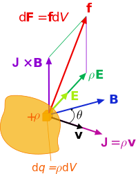 Lorentz force (per unit 3-volume) f on a continuous charge distribution (charge density ρ) in motion. The 3-current density J corresponds to the motion of the charge element dq in volume element dV and varies throughout the continuum.