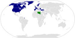 خريطة تظهر مواقع الدول التي شاركت في فرض حظر الطيران فوق ليبيا (باللون الأزرق) وموقع منطقة حظر الطيران وهي ليبيا (باللون الأخضر).