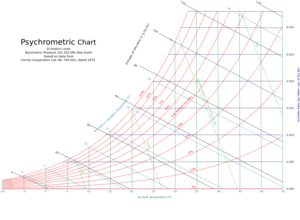 - Psychrometric Chart - Detailed psychrometric chart including curves for enthalpy, air mass, and water mass.