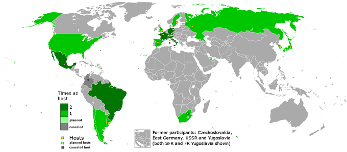Map of FIFA World Cup final hosts, 1930–2022. Green: once; dark green: twice; light green: planned