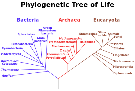 A hypothetical phylogenetic tree of all extant organisms, based on 16S rRNA gene sequence data, showing the evolutionary history of the three domains of life, bacteria, archaea and eukaryotes. Originally proposed by Carl Woese.