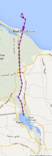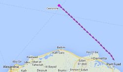 صباح 14 يونيو 2014: كاستورونه تنتقل بسرعة 9.4 عقدة لتعمل على بعد 10 كم شمال بورسعيد. |