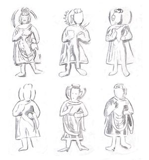 The iconography of these three types is very different from that of the other deities depicted in Kanishka's coinage. Whether Kanishka's deities are all shown from the side, the Buddhas only are shown frontally, indicating that they were copied from contemporary frontal representations of the standing and seated Buddhas in statuary.[28] Both representations of the Buddha and Shakyamuni have both shoulders covered by their monastic gown, indicating that the statues used as models were from the Gandhara school of art, rather than Mathura.