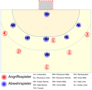 في العادة، يكون التشكيل خط الدفاع لفريق كرة اليد على أرض الملعب (6-0)؛ حيث يصطف جميع لاعبي الدفاع بين خط 6 متر وخط 9 متر لتكوين حائط صد. وقد يكون التشكيل (5-1)؛ حيث يقوم أحد اللاعبين بتصويب الكرة نحو المرمى عندما يتحرك خارج خط 9 متر، بينما يظل بقية لاعبي الدفاع الخمسة مصطافين عند خط 6 متر. أما التشكيل الأقل استخدامًا في كرة اليد، فهو (4-2) عندما يتقدم اثنان من المدافعين خارج خط الدفاع. وتستخدم الفرق التي يتمتع لاعبوها بمهارة فائقة في الجري التشكيل الدفاعي (3-3)، الذي يشبه وضع مراقب على كل لاعب. ومما لا شك فيه أن الأسلوب الخاص بتشكيل اللاعبين من مهاجمين ومدافعين على أرض الملعب يختلف بدرجة كبيرة من دولة لأخرى؛ حيث أن لكل دولة خطة اللعب الخاصة بها. وفي بعض الأحيان يطلق على التشكيل الدفاعي (6-0) "الدفاع المباشر"، بينما يطلق على باقي أنماط التشكيل "الدفاع الهجومي".[بحاجة لمصدر]