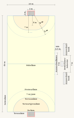 جميع المعلومات الواردة في هذا الجزء تمثل [1] والمتعارف عليها دوليًا وفقًا للاتحاد الدولي لكرة اليد، ما لم يذكر خلاف ذلك. قالب:تعظيم=== الملعب === تقام مباراة كرة اليد على ملعب طوله 40 متر وعرضه 20 متر (40 × 20 متر)، ويقع المرمى في المنتصف. ويوجد في الملعب مرميان يحاط كل منهما بمساحة شبه دائرية تقريبًا تعرف بمنطقة المرمى، والتي تتحدد بخط يبعد بمسافة 6 أمتار عن المرمى. كما يوجد خط شبه دائري على هيئة نقاط يبعد عن المرمى بمسافة 9 أمتار، ويعرف هذا الخط بـ "خط الرمية الحرة". وكل خط في الملعب يعد جزءًا من المساحة المحيط بها. وهذا يعني أن خط المنتصف يعد جزءًا من نصفي الملعب.