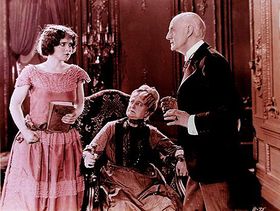 Bow as "Janet", the "horrid" flapper in Black Oxen (1923), holding Flaming Youth to her chest; with Kate Lester and Tom Ricketts