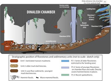 The fossils of the Dinaledi chamber have been dated to between 335,000 and 236,000 years ago, long after much larger-brained and more modern-looking hominins had appeared.[33][34] Geologists estimate that the cave in which the fossils were discovered is no older than three million years,[6] and the ages for flowstone where the fossils were recovered from was interpreted to be deposited between 236,000 and 414,000 years ago.[33]