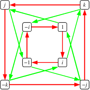 مخطط كايلي لـ Q8. الأسهم الحمراء تمثل الضرب من اليمين في i، والأسهم الخضراء تمثل الضرب من اليمين في j.
